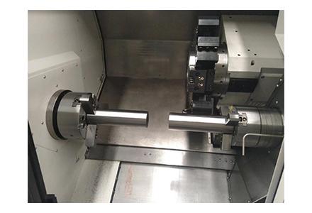 2)主軸箱及副主軸箱采用電主軸結(jié)構(gòu),主軸轉(zhuǎn)速高,剛性好,動(dòng)態(tài)響應(yīng)快,提高了加工圓度和表面的精度。對(duì)列式雙電主軸結(jié)構(gòu)可在高速旋轉(zhuǎn)的情況下進(jìn)行工件交換,配合12工位伺服刀架,可實(shí)現(xiàn)對(duì)工件的全部或大部分工序的加工,很大程度上節(jié)省了裝夾和加工時(shí)間,提高了加工效率。雙C軸功能可在任一主軸上進(jìn)行工件分度和曲面插補(bǔ)加工。